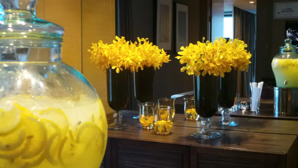 Combining drinks with flowers: a bright setup of Yellow Orchids and refreshing Lemonade! The Floral Designers develop unique Floral concepts for events on location, anywhere around the world. www.thefloraldesigners.com