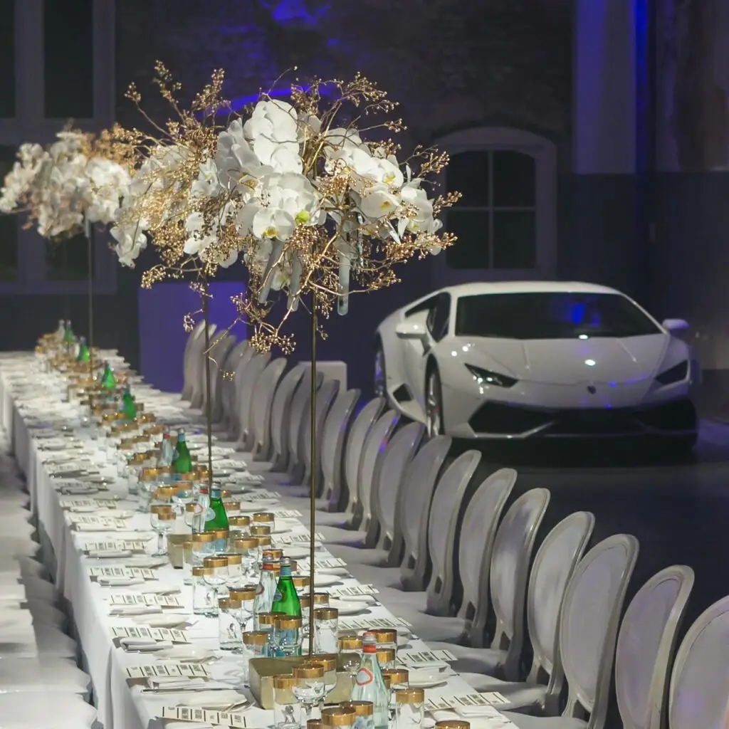 A Lamborghini, White Cows, ‘Phalaenopsis’ Orchids, Coo kook Clocks and Golden Berries! The Floral Designers develop unique Floral concepts for events on location, anywhere around the world. www.thefloraldesigners.com
