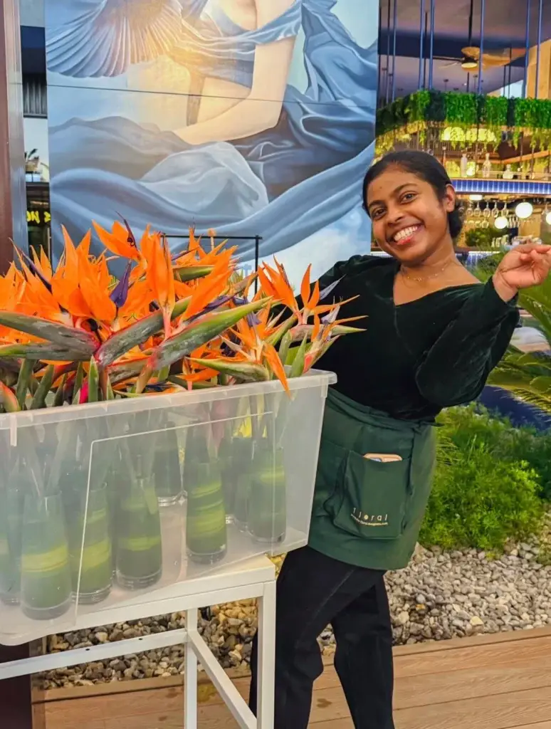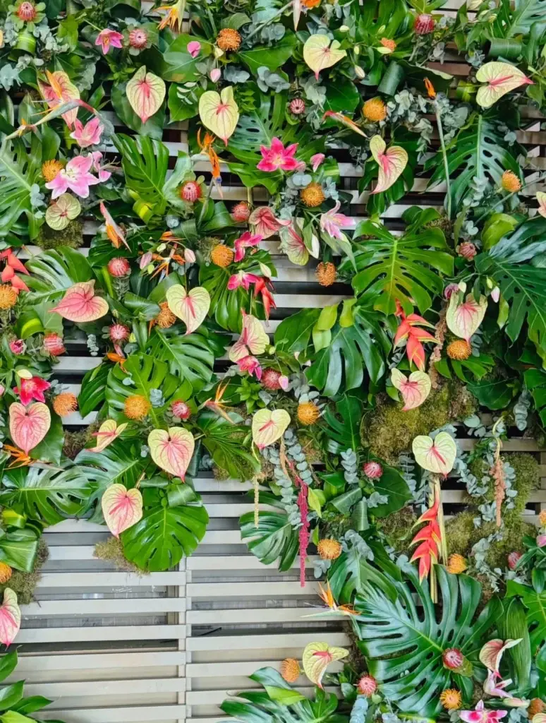 Each element was placed with care: strong monster leaves, vibrant paradise birds, playful palm canes, orchids, and ferns, all coming together with wooden structures to echo the hotel’s natural elegance.