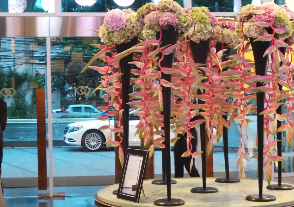 Decoration a five-start hotel lobby in Bangkok, with a fusion of the tropical Heliconia from Thailand and a selection of French countryside Hydrangea’s.