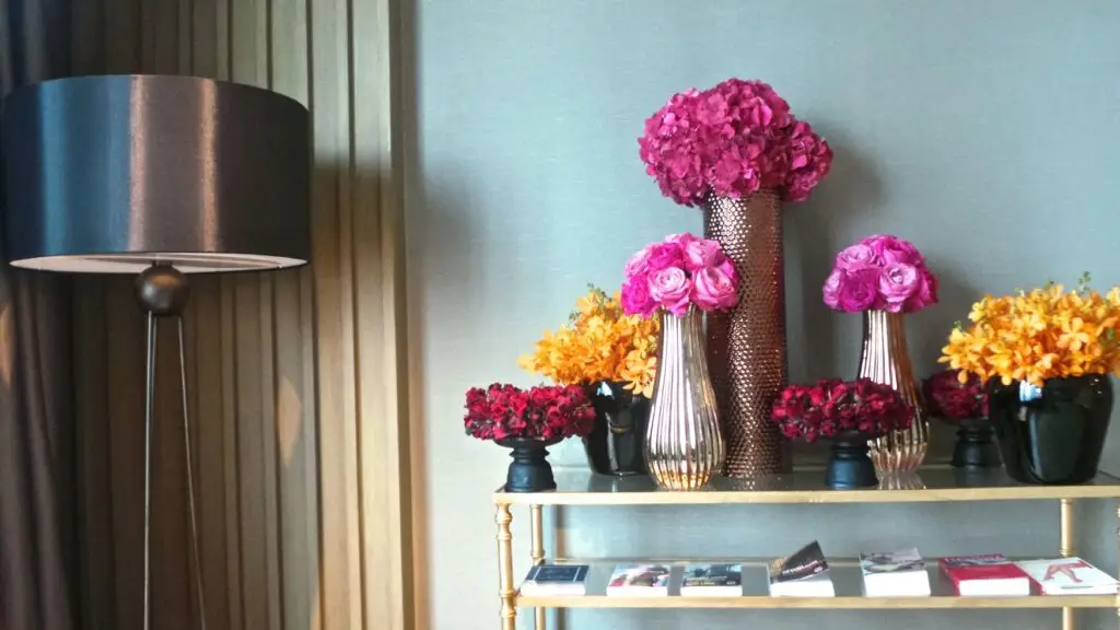 Executive suite decoration with a bold color combination of pink and orange mixed with bordeaux red. Forming a colorful and stylish Floral decoration for an executive suite in the Sofitel Sukhumvit in Bangkok.